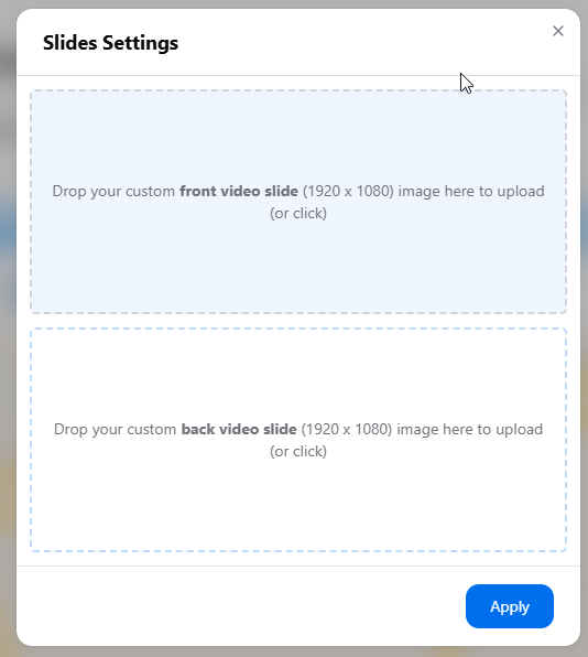 9. It also allows you to add your custom front and back video slide using an image, at the specified size 1920 x 1080 pixels.